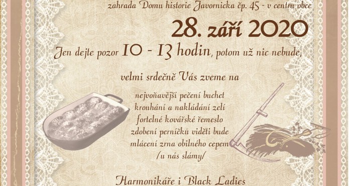 Velmi srdečně vás zveme na nejvoňavější pečení buchet, krouhání zelí a nakládání zelí, fortelné kovářské řemeslo, zdobení perníčku viděti bude, mlácení zrna obilného cepem.