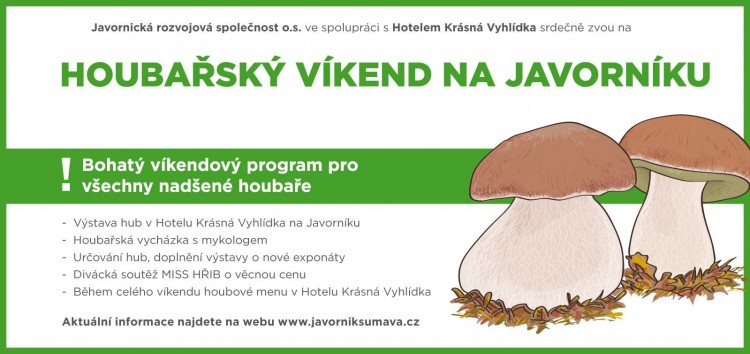 Javornický rozvojový spolek ve spolupráci s Hotelem Krásná Vyhlídka Vás srdečně zvou na HOUBAŘSKÝ VÍKEND NA JAVORNÍKU. Máme připravený bohatý program pro všechny nadšené houbaře. Výstava hub bude zahájena v pátek od 19:30 a potrvá do neděle do 12:00. Celý program naleznete na plakátu k akci. Těšíme se zejména na oblíbenou diváckou soutěž MISS Hřib, exponáty o nejkrásnějšího “Praváka” je možné přihlašovat do soboty 15:00.