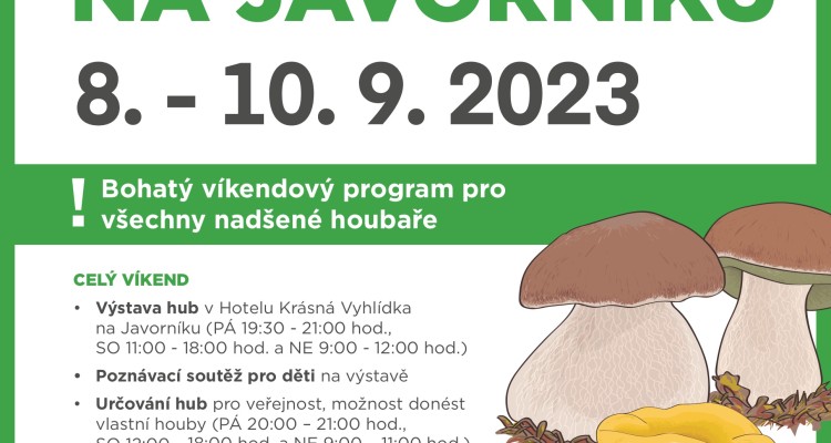 Javornický rozvojový spolek ve spolupráci s Hotelem Krásná Vyhlídka Vás srdečně zvou na HOUBAŘSKÝ VÍKEND NA JAVORNÍKU. Máme připravený bohatý program pro všechny nadšené houbaře. Výstava hub bude zahájena v pátek od 19:30 a potrvá do neděle do 12:00. Celý program naleznete na plakátu k akci. Těšíme se zejména na oblíbenou diváckou soutěž MISS Hřib, exponáty o nejkrásnějšího “Praváka” je možné přihlašovat do soboty 15:00.