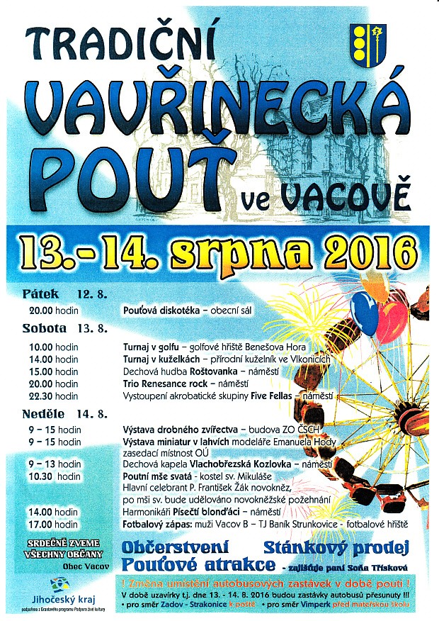Obecní úřad Vacov Vás srdečně zve na tradiční Vavřineckou pouť, která se letos uskuteční již tento víkend ve Vacově na autobusovém nádraží.